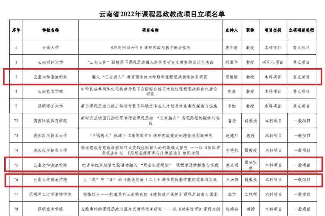 近日,云南省教育厅公布2022年课程思政教改项目立项名单,我校3个项目立项,其中建筑工程学院教师贾丽丽教授《融入“三全育人”教育理念的大学数学课程思政教学体系研究》获重点项目,创新创业学院院长徐东明副研究员《把青年红色筑梦之旅活动融入“职业生涯规划”课程建设的探索与实践》、外国语学院副院长王兴伟副教授《以“思”守“正”的<高级英语(二)>课程思政教学重构改革与实践》获一般项目。