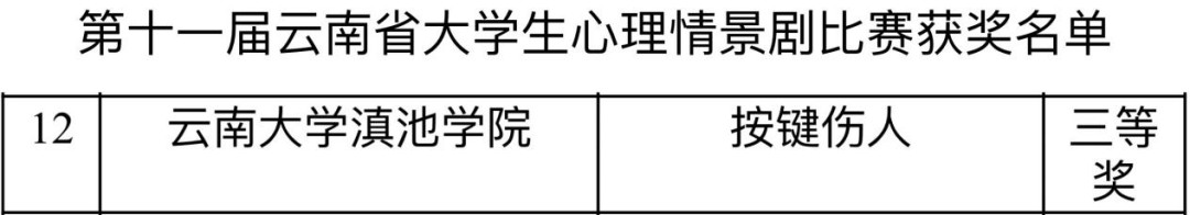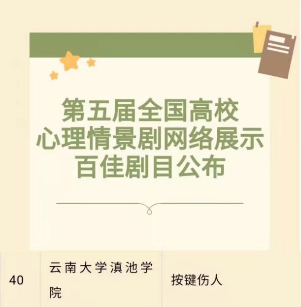 2022年7月,我校选送的心理情景剧《按键伤人》在第五届全国高校心理情景剧优秀剧目展中荣获网络展示百佳剧目,在第十一届云南省大学生心理情景剧比赛中荣获三等奖。