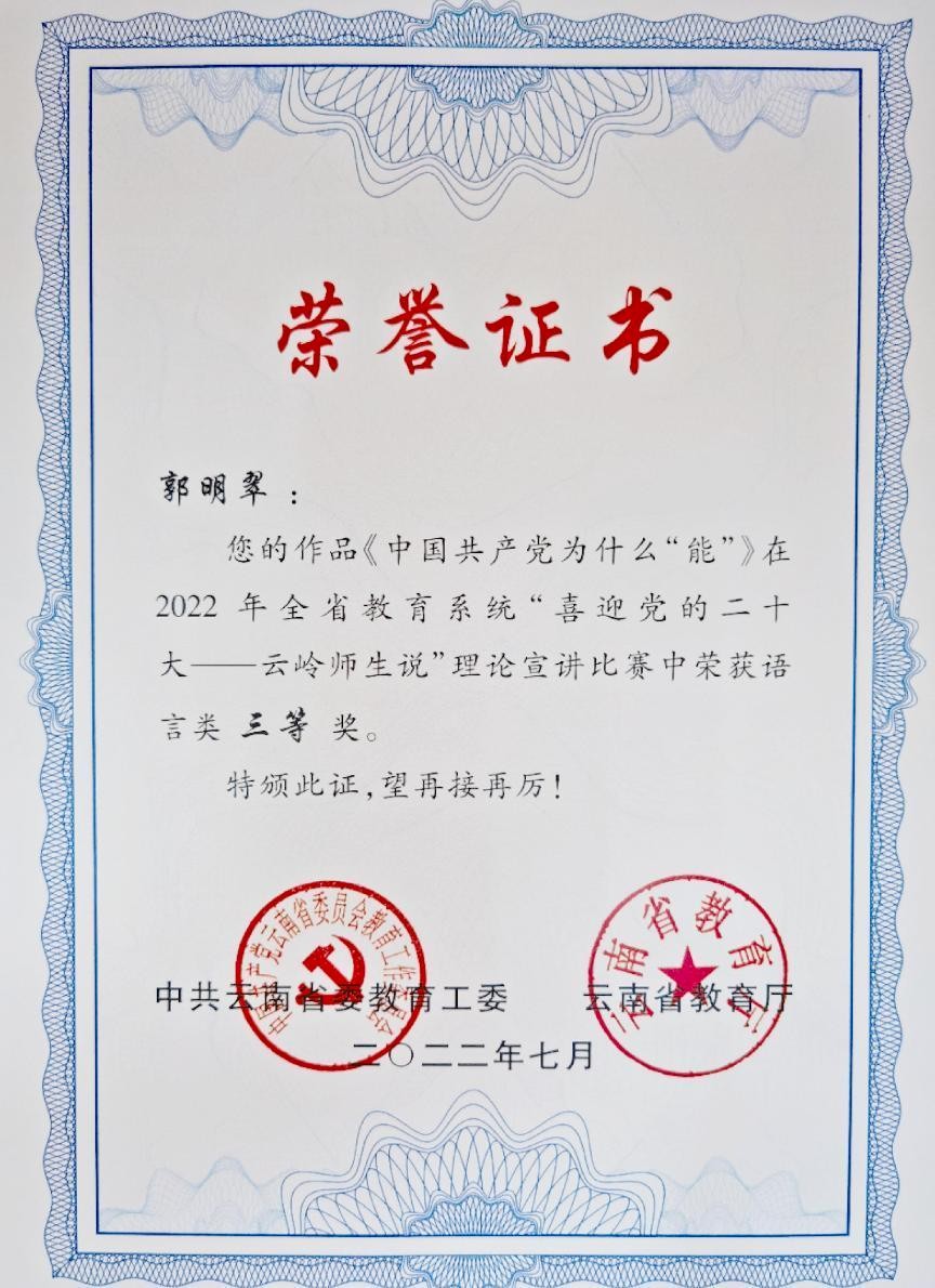 近日,中共云南省委教育工委、云南省教育厅公布了2022年理论宣讲比赛获奖情况,我校教师郭明翠《中国共产党为什么“能”》在全省教育系统“喜迎党的二十大——云岭师生说”理论宣讲比赛中获得“语言类”三等奖。