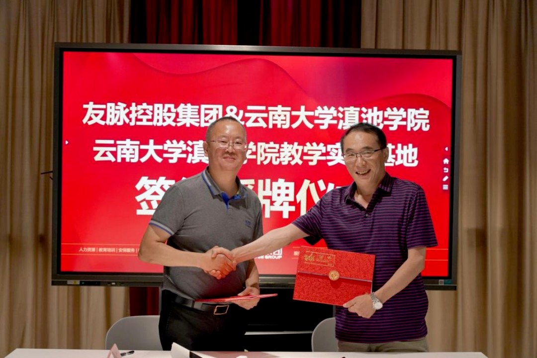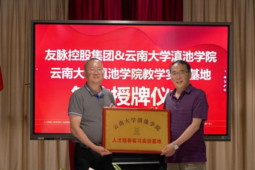 近日,云南大学滇池学院副院长、管理学院院长张建东教授一行前往友脉控股集团访企拓岗。校企双方共同签订了《云南大学滇池学院和友脉控股集团人才培养实习实训基地合作协议书》,并举行了授牌仪式。