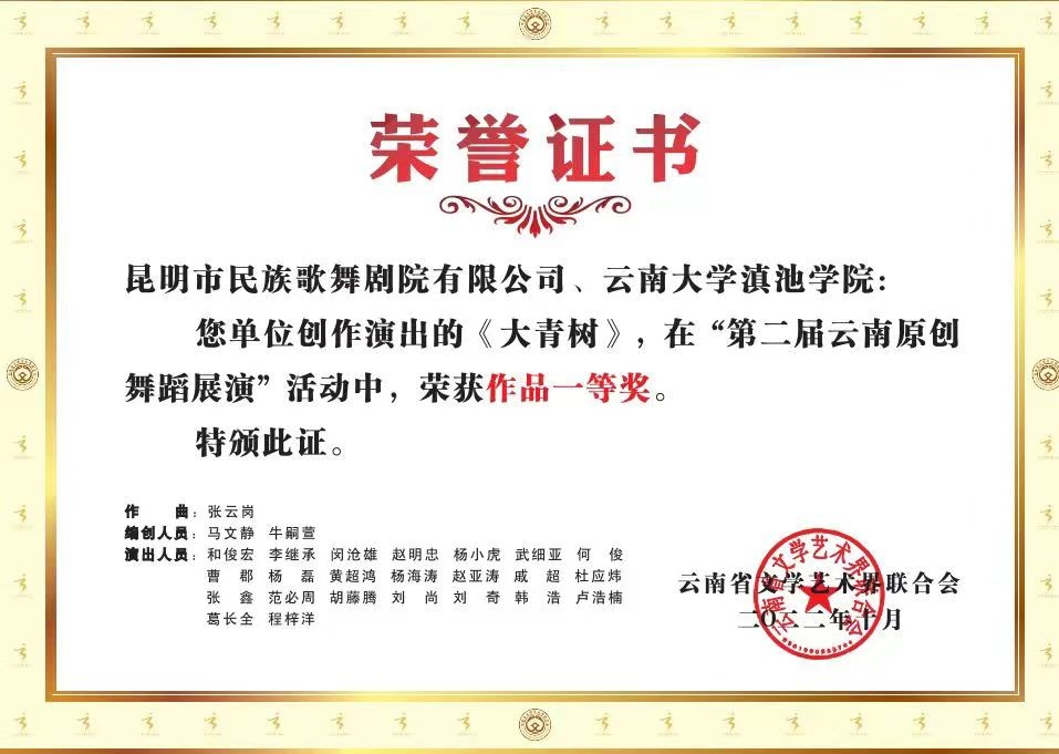 此次大赛全省各艺术院校、文化馆、演艺中心、歌舞团向大赛选送共150件作品。经过初评、复评、终评出入围作品45件,并经舞蹈专家公平公正公开评选,共选出展演一等奖作品6件,二等奖作品11件,三等奖作品15件,我校与昆明市民族歌舞剧院联合选送的节目《大青树》荣获一等奖,我校独立选送的节目《江之歌》荣获三等奖,《心中的歌》获评最终入围作品。