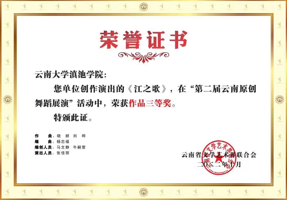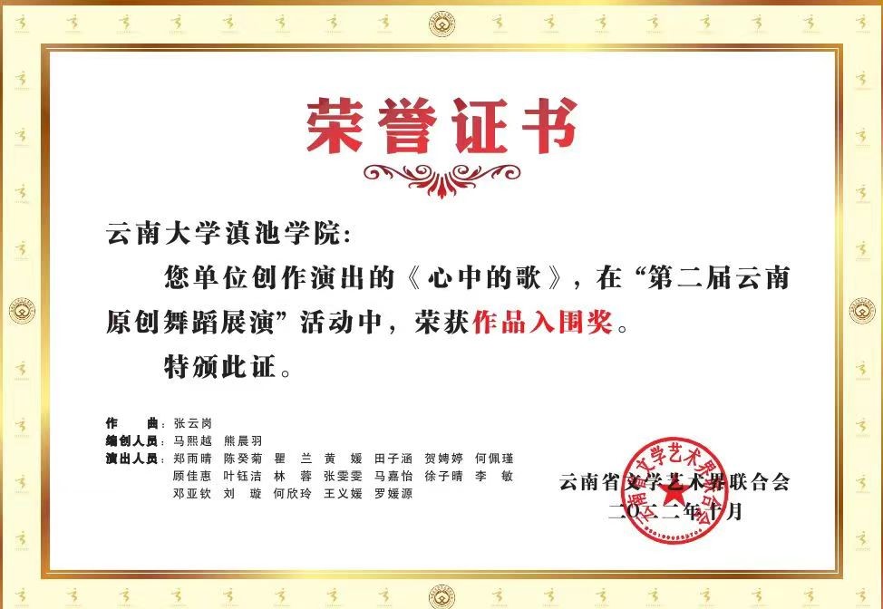 近日,由云南省文学艺术界联合会主办、云南省舞蹈家协会承办的第二届云南原创舞蹈展演活动结果揭晓,我校选送的三个节目从全省上百个节目中脱颖而出,全部入围最终现场展演,并荣获一等奖一项,三等奖一项,作品入围奖一项,我校同时荣获优秀组织奖!
