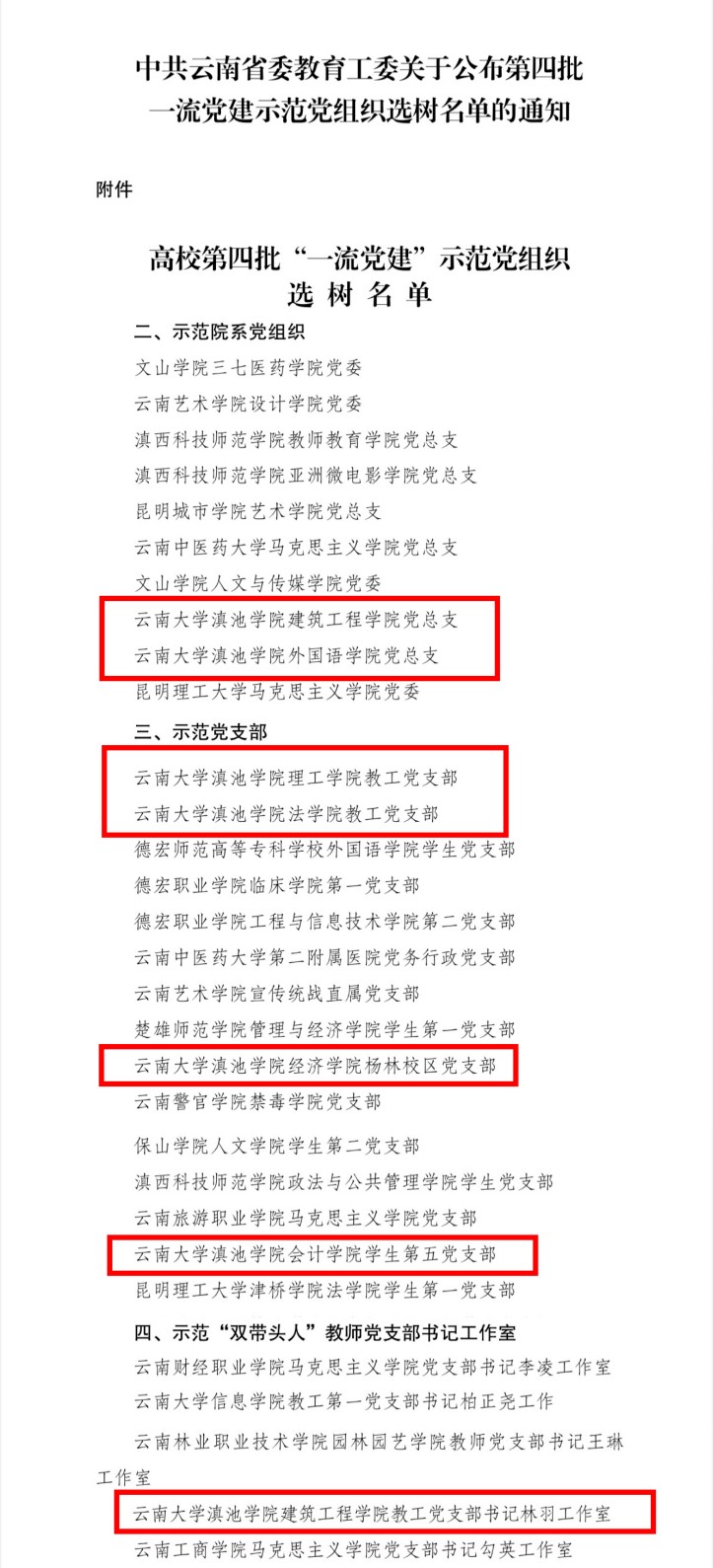 近日,中共云南省委教育工委公布了第四批“一流党建”示范党组织选树名单,我校建筑工程学院党总支、外国语学院党总支被评为第四批“示范院系党组织”;理工学院教工党支部、法学院教工党支部、经济学院杨林校区党支部、会计学院学生第五党支部被评为“示范党支部”;建筑工程学院教工党支部书记林羽工作室被评为“示范‘双带头人’教师党支部书记工作室”。