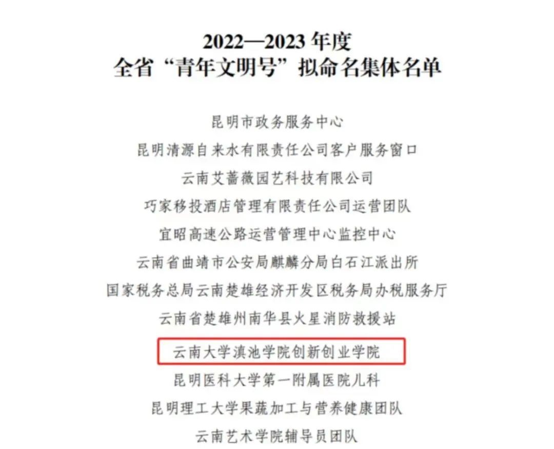 近日,按照《关于开展2022——2023年度全省“青年文明号”创建工作的通知》及《青年文明号活动管理办法》相关要求,经校团委推报,创建活动组委会评审会议评审,我校创新创业学院拟被共青团云南省委命名为2022—2023年度全省“青年文明号”!这是我校创建的首个省级“青年文明号”集体,我校也是此次创建活动中唯一入选的民办高校。
