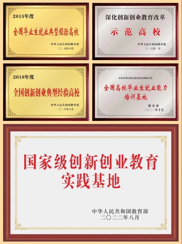 获全国毕业生就业典型经验高校、全国深化创新创业教育改革示范高校、全国创新创业典型经验高校、全国高校毕业生就业能力培训基地、国家级创新创业教育实践基地、全国青年红色筑梦之旅先进集体、首批全国党建工作样板支部、教育部新文科研究与改革实践项目、教育部万名优秀创新创业导师、第22届全国五四青年奖候选人等。