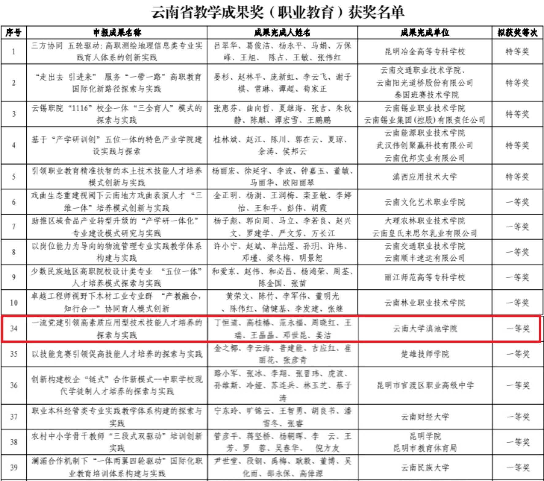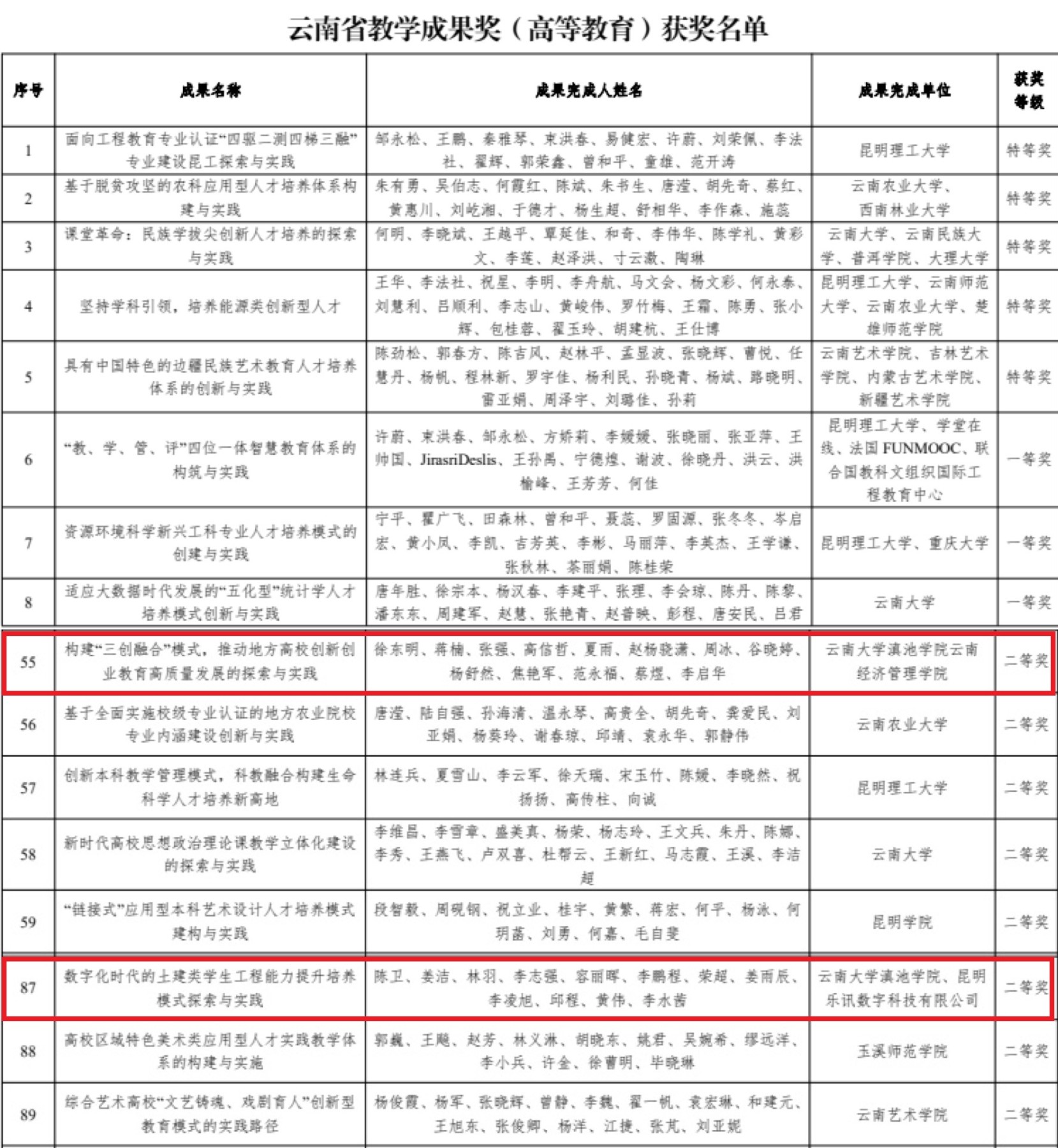 近日,云南省教育厅、云南省人力资源和社会保障厅公示了2022年云南省教学成果奖评选结果。我校喜获3项2022年云南省教学成果奖。其中,《一流党建引领高素质应用型技术技能人才培养的探索与实践》获云南省教学成果奖(职业教育)一等奖,《构建“三创融合”模式,推动地方高校创新创业教育高质量发展的探索与实践》《数字化时代的土建类学生工程能力提升培养模式探索与实践》获云南省教学成果奖(高等教育)二等奖。