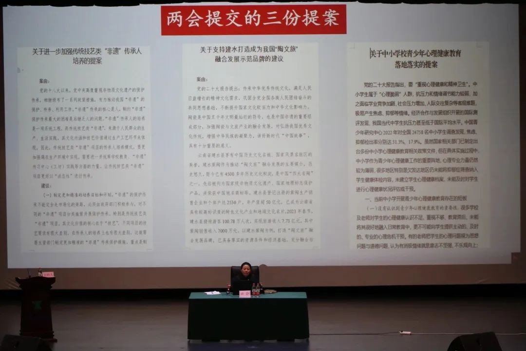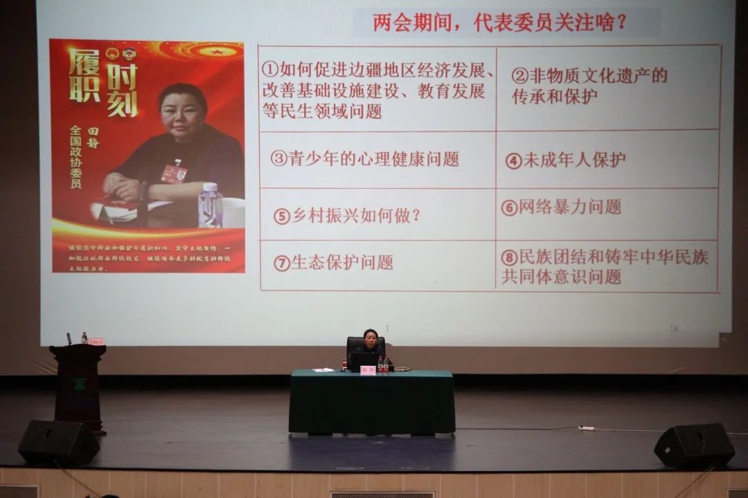 田静委员与在场师生分享了自己履职政协委员所关心关注的问题以及向“两会”提交的提案。她指出,政协委员要深入调查研究,努力当好界别群众的代言人;强化政治责任,努力当好新时代党的方针政策的宣传员;肩负使命担当,努力当好优秀传统文化的传播者。