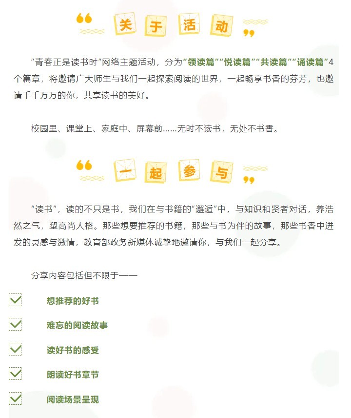 读书者,正青春。世界读书日到来之际,在教育部新闻办公室指导下,由教育部宣传教育中心主办,教育部政务新媒体联动教育政务新媒体联盟推出的“青春正是读书时”网络主题活动正式启动。