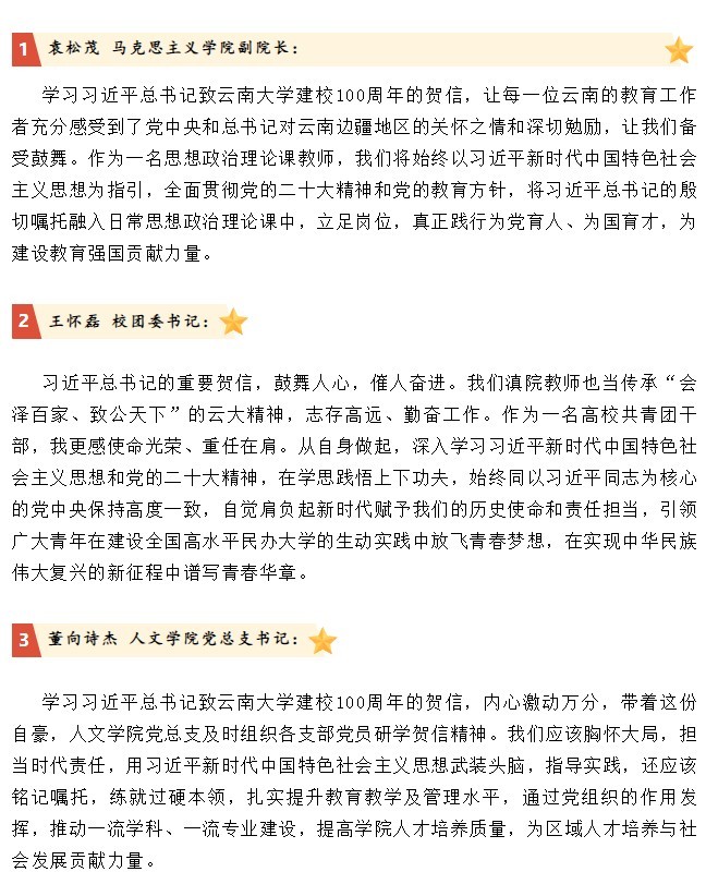 2023年4月20日,中共中央总书记、国家主席、中央军委主席习近平致信祝贺云南大学建校100周年,向全体师生员工和广大校友致以热烈的祝贺和诚挚的问候。
