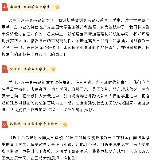 广大师生热议贺信精神,纷纷表示将牢记习近平总书记的殷切嘱托,坚定不移听党话、跟党走,在强国建设、民族复兴的新征程上,勇担职责使命,把习近平总书记的亲切关怀、深厚感情和殷切期望转化为改革创新、奋发作为的前进动力,为党育人、为国育才,为建设教育强国作出新的更大贡献。在此摘录部分师生的心得体会。