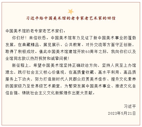 中共中央总书记、国家主席、中央军委主席习近平5月21日给中国美术馆的老专家老艺术家回信,在中国美术馆建馆开放60周年之际,向全馆同志致以热烈祝贺和诚挚问候。