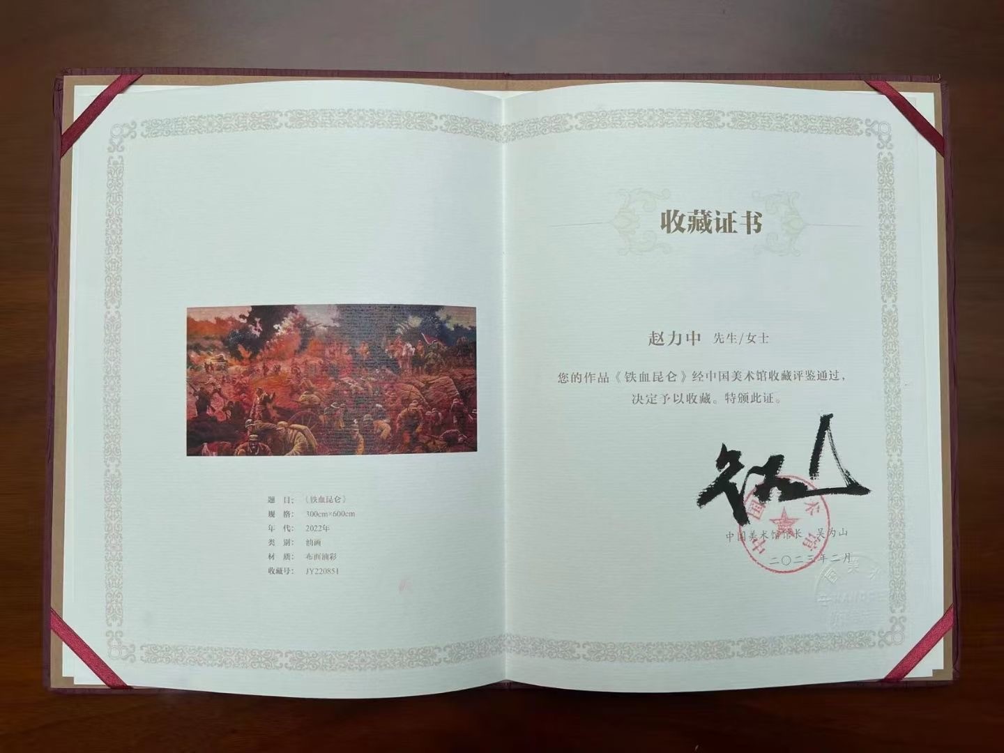 在习近平总书记回信前夕,赵力中教授经过一年的艰辛创作的大型历史油画《铁血昆仑》捐赠收藏仪式于5月9日在北京中国美术馆隆重举行。