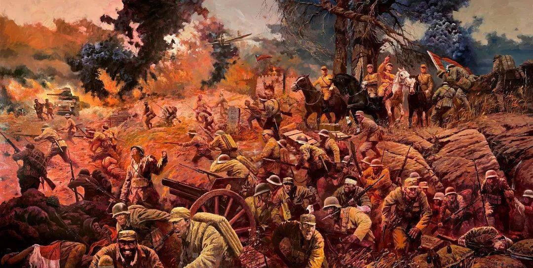 油画中的昆仑关,炮火纷飞,地动山摇,笼罩着火光和浓烟。画面以暖红色为基调,烘托战争氛围,冲锋的人浪彼此起伏,士兵们拼杀勇猛,天空日机呼啸、投弹疯狂,古树萧煞、枯叶飘飘,指挥军人镇定自若立于磐石。作品强调画面的视觉冲击力,力求再现历史的战争惨烈锋烟画面,强烈紧张的色彩氛围制造出紧张感,使读者身临其境地感受中国军民同仇敌忾、浴血奋战的场面,真实反映了昆仑关战役的激烈、悲壮。