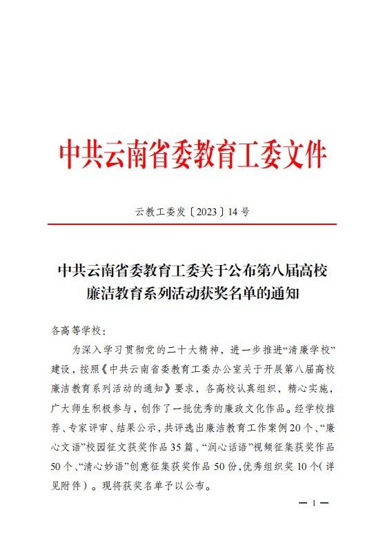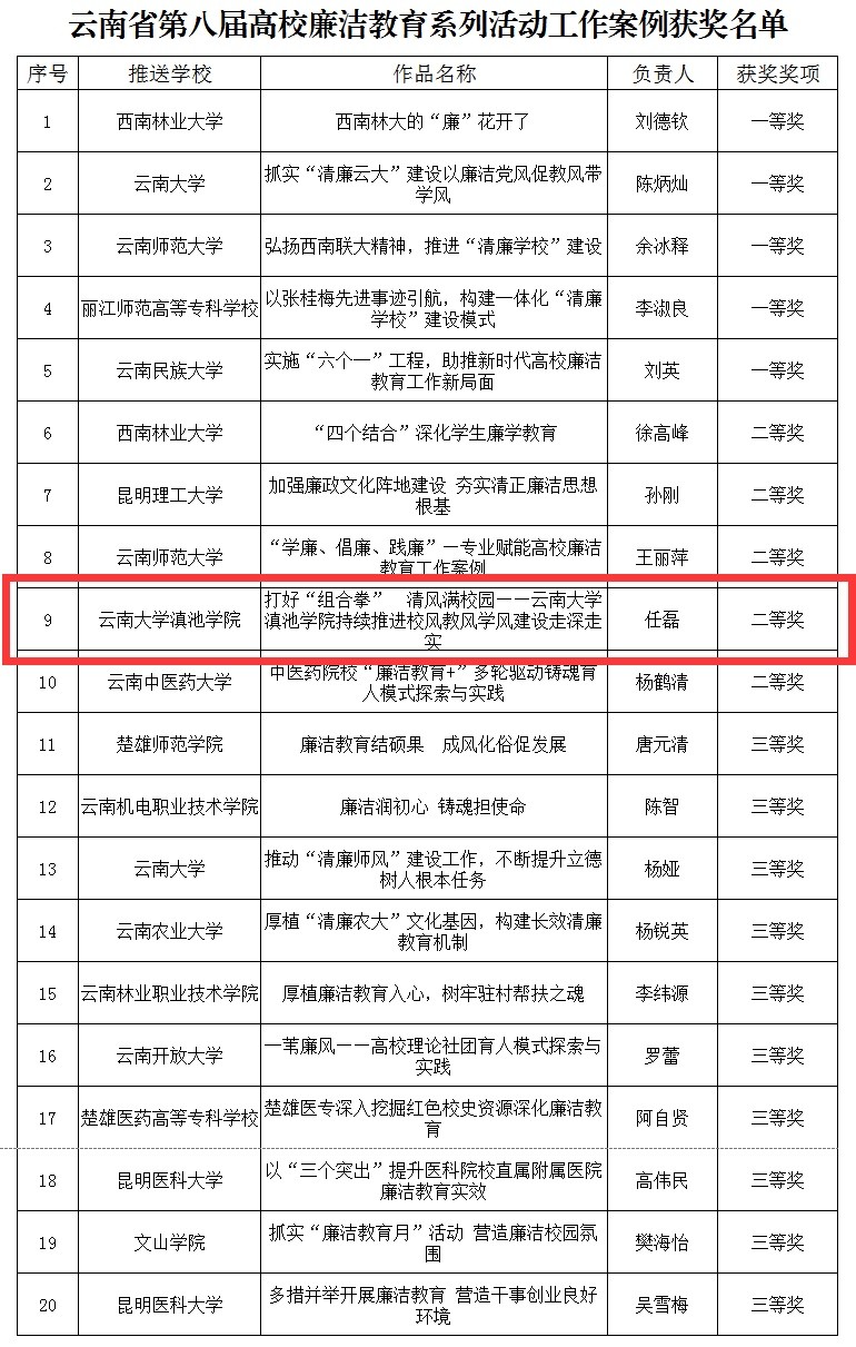 近日,中共云南省委教育工委公布了第八届高校廉洁教育系列活动获奖名单,我校选送的高校廉洁教育工作案例《打好“组合拳” 清风满校园——云南大学滇池学院持续推进校风教风学风建设走深走实》荣获二等奖,是云南省唯一获此荣誉的民办高校。