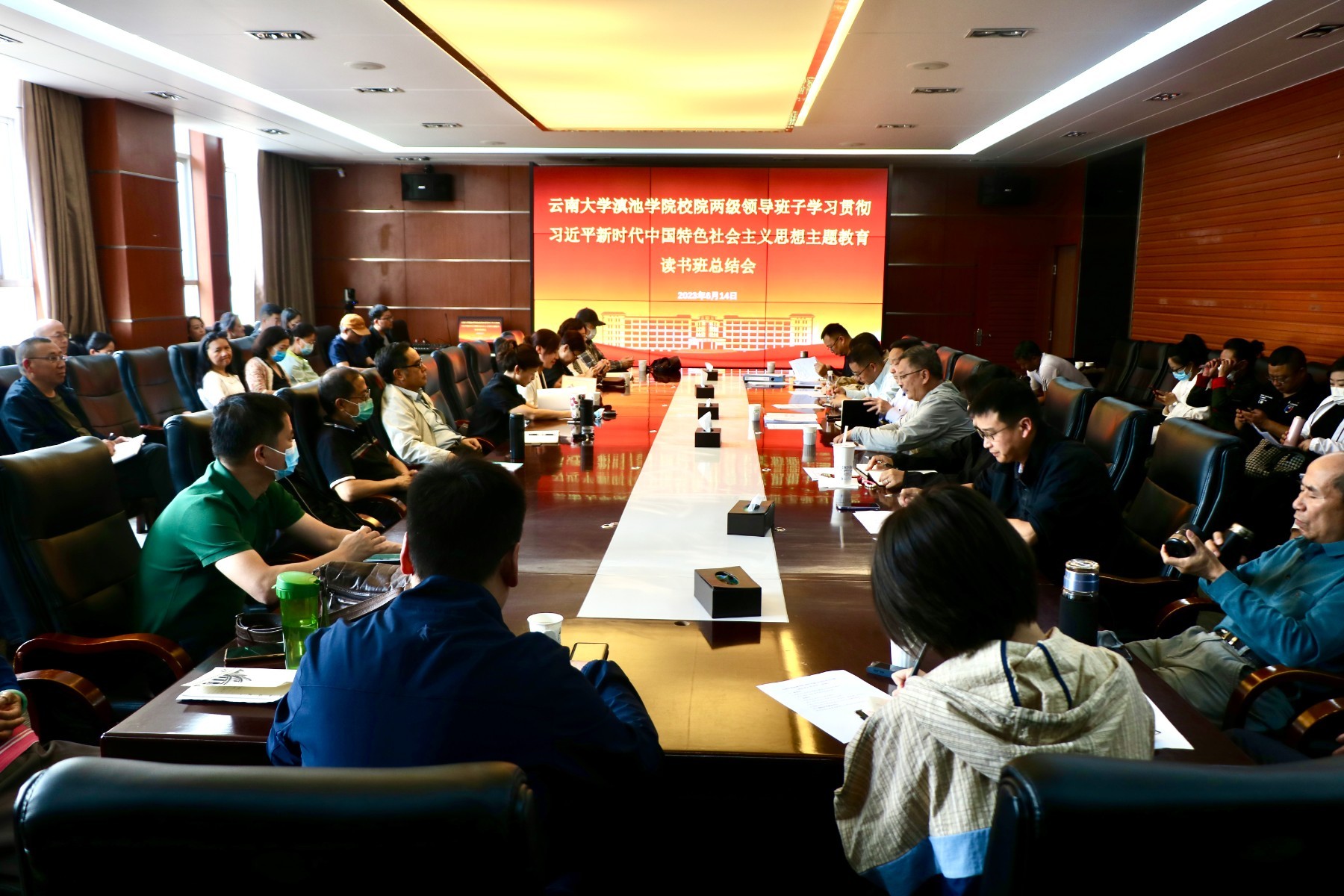 6月14日,云南大学滇池学院校院两级领导班子学习贯彻习近平新时代中国特色社会主义思想主题教育读书班总结会在海埂校区崇志楼一号会议室举行。校院两级领导班子学习贯彻习近平新时代中国特色社会主义思想主题教育集中学习读书班全体成员参加会议。