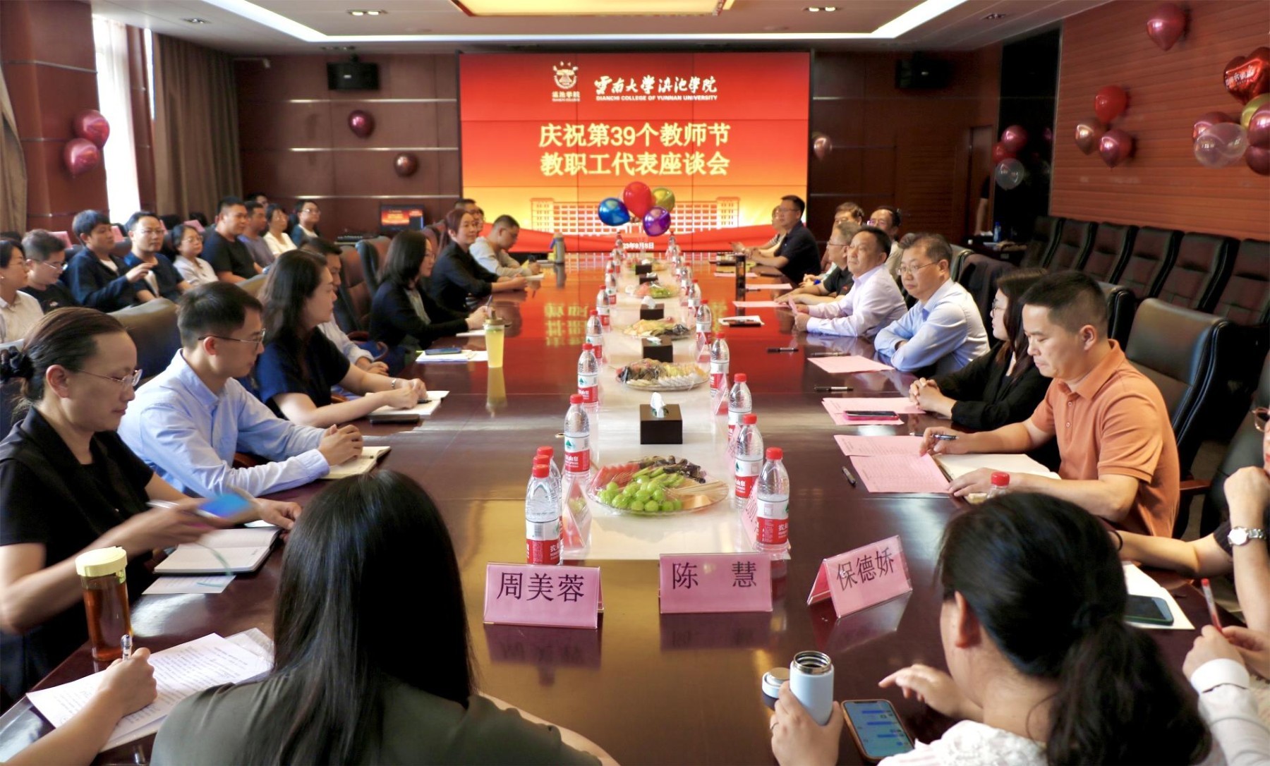 9月8日下午,云南大学滇池学院在海埂校区崇志楼一号会议室举行庆祝第39个教师节教师座谈会。学校领导、董事会办公室主任,2023年云南省民办教育教书育人优秀教师和优秀教学团队主要负责人,2001年至2023年入职学校的教职工代表,党政办公室、人事处等相关部门负责人参会。