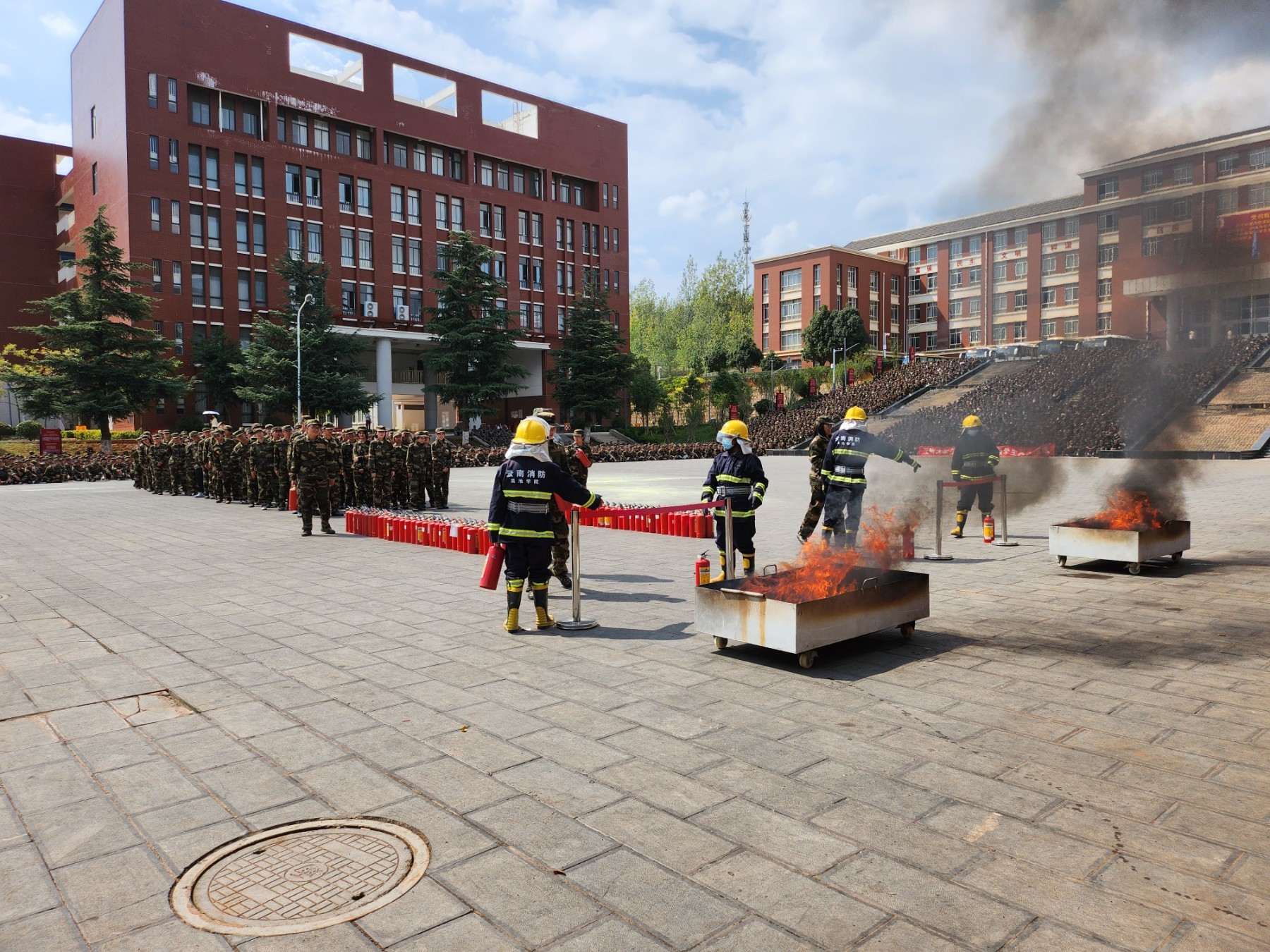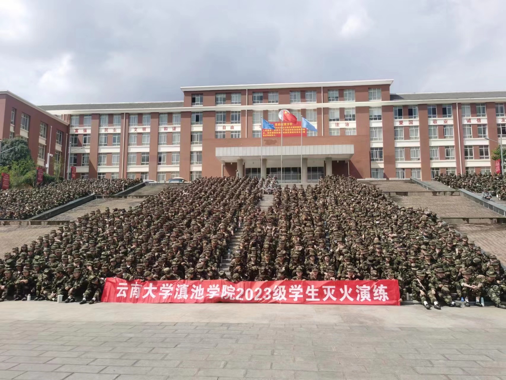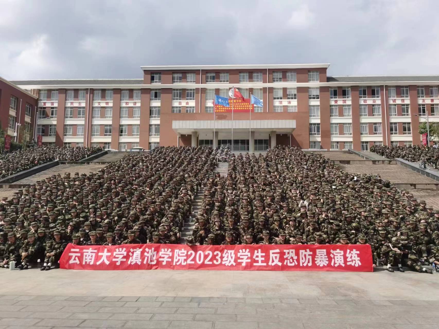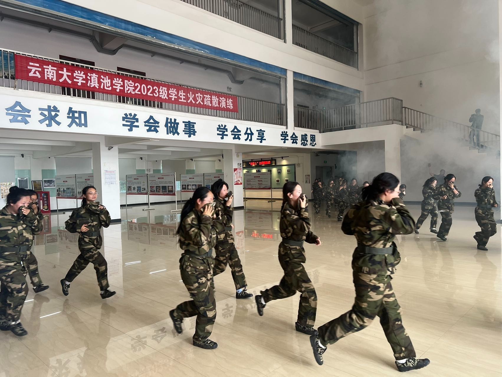 9月11日下午,云南大学滇池学院组织2023级新生在杨林校区开展火灾疏散演练、地震疏散演练、反恐防暴演练、灭火演练。