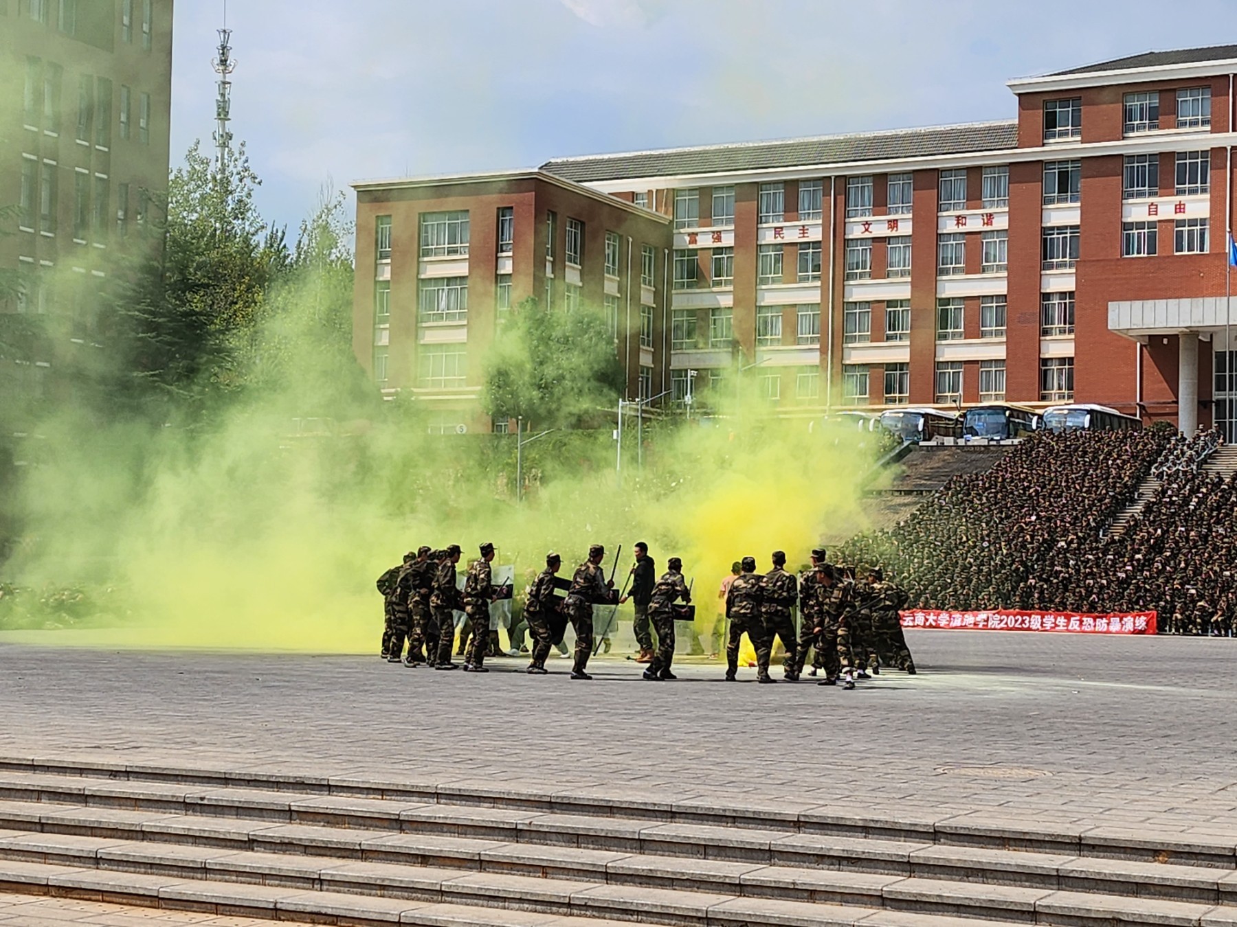 疏散演练结束后,参加演练的同学在杨林校区英才广场集合,接着开展校园反恐防暴应急处突演练,演练活动在各部门、各参练人员的积极配合下,短时间内解除危险,达到防暴演练的预期目的。