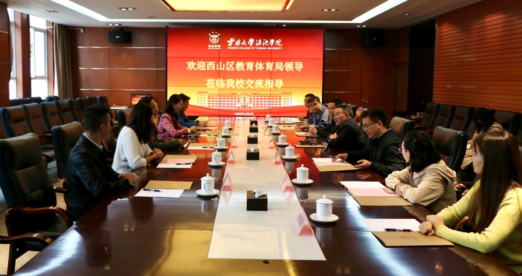 10月8日下午,西山区教育党工委常务副书记、党组书记何昱,西山区教育体育局局长周兰,副局长赵丽娅,人事科科长邬继恒,人事科干部杨朝元一行到我校海埂校区交流指导。云南大学滇池学院党委书记丁恒道,党委委员、党委教师工作部部长、人事处处长李启华,党政办公室主任任磊,招就处处长蔡煜,校工会、总务处、校团委等职能部门相关人员参与交流。