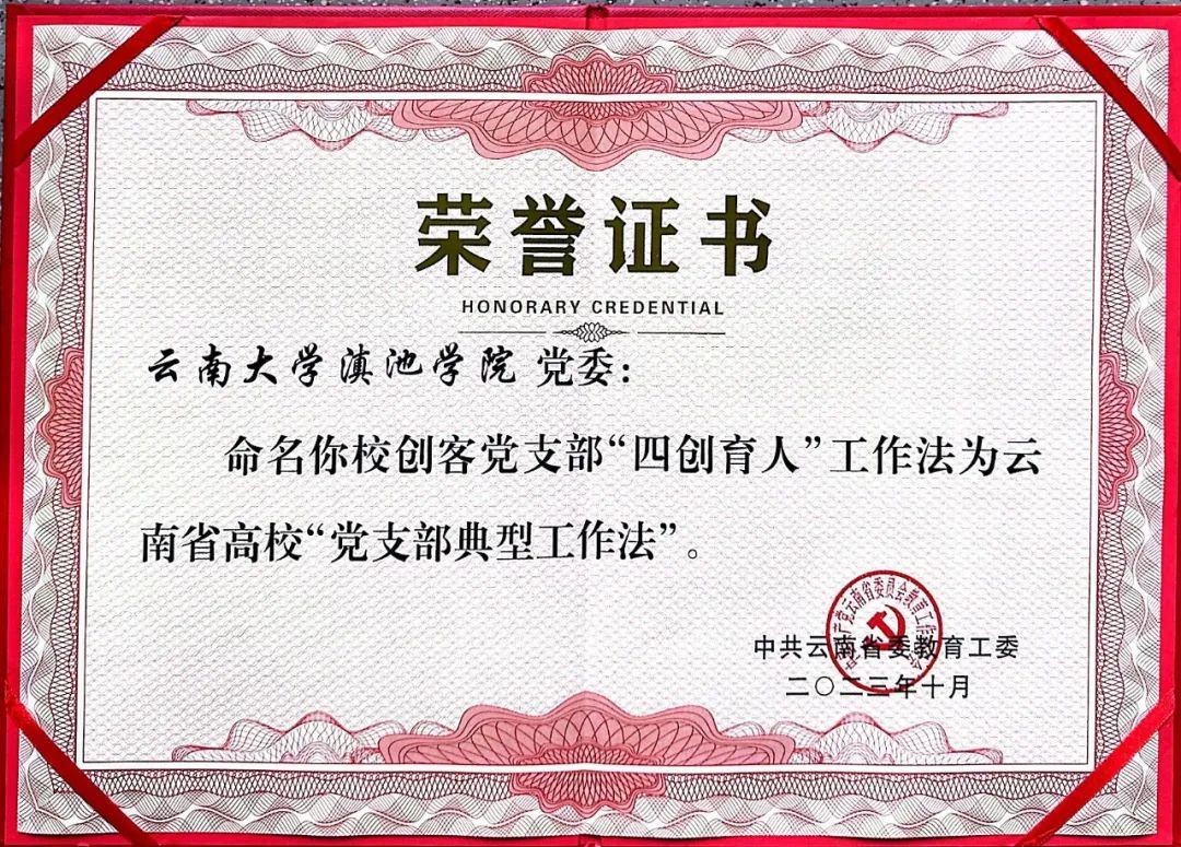 2023年10月9日,中共云南省委教育工委举办云南省高校一流党建创建经验交流会议暨党务工作队伍素质能力展示活动,在全省高校遴选出10个“党支部典型工作法”,云南大学滇池学院创客党支部“四创育人”工作法被命名为云南省高校“党支部典型工作法”。