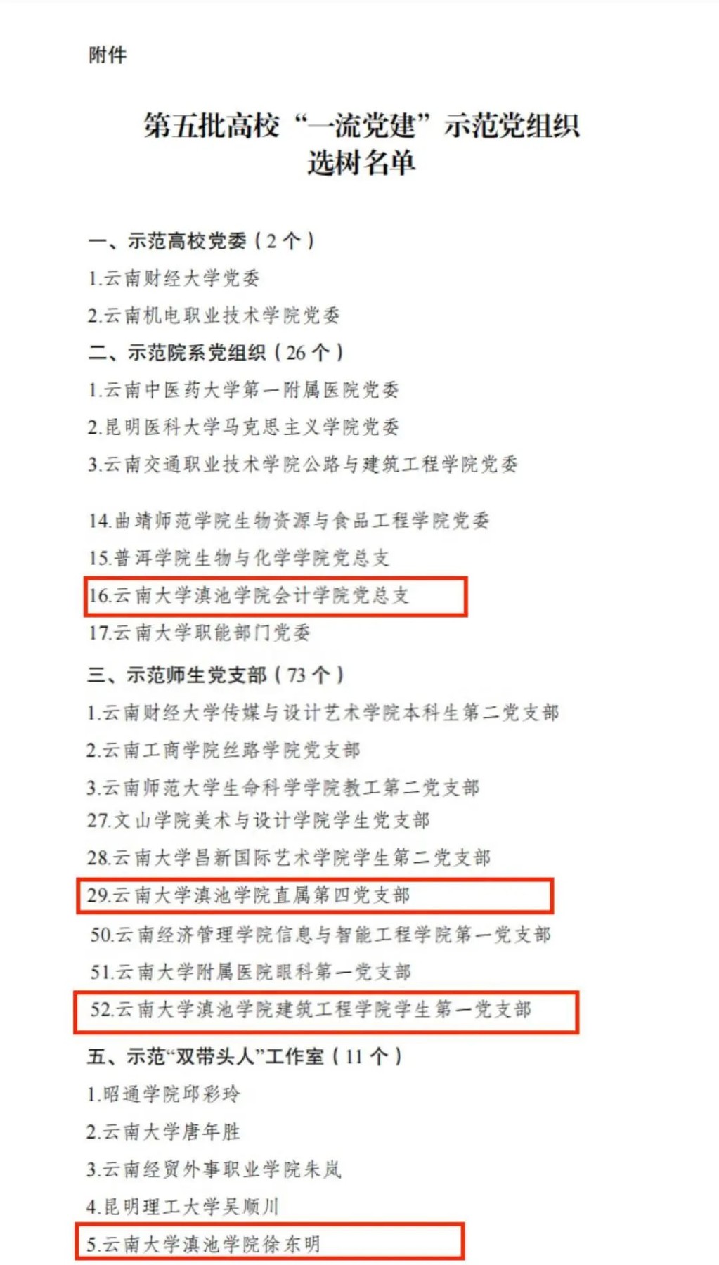 近日,中共云南省委教育工委公布了第五批“一流党建”示范党组织选树名单,我校会计学院党总支被评为第五批“示范院系党组织”;直属第四党支部、建筑工程学院学生第一党支部被评为“示范师生党支部”;创客党支部书记徐东明工作室被评为“示范‘双带头人’工作室”。