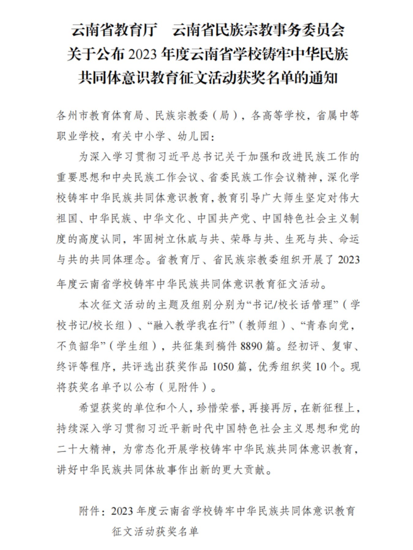 近日,云南省教育厅、云南省民族宗教事务委员会公布了 2023 年度云南省学校铸牢中华民族共同体意识教育征文活动获奖名单,我校选送的优秀论文荣获一等奖1项、三等奖2项。