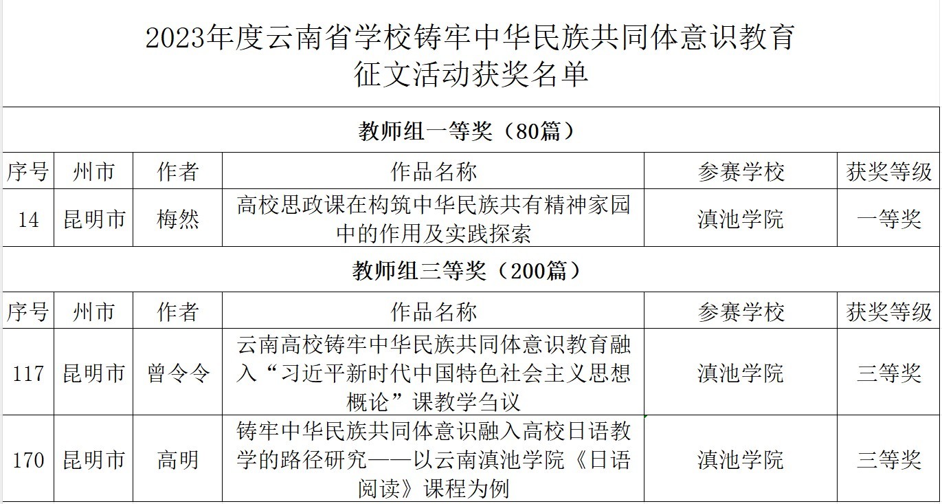 在本次征文活动“融入教学我在行”(教师组)的评选中,我校马克思主义学院梅然老师论文《高校思政课在构筑中华民族共有精神家园中的作用及实践探索》荣获一等奖;马克思主义学院曾令令老师论文《云南高校铸牢中华民族共同体意识教育融入“习近平新时代中国特色社会主义思想概论”课教学刍议》荣获三等奖,外国语学院高明老师论文《铸牢中华民族共同体意识融入高校日语教学的路径研究——以云南滇池学院<日语阅读>课程为例》荣获三等奖。