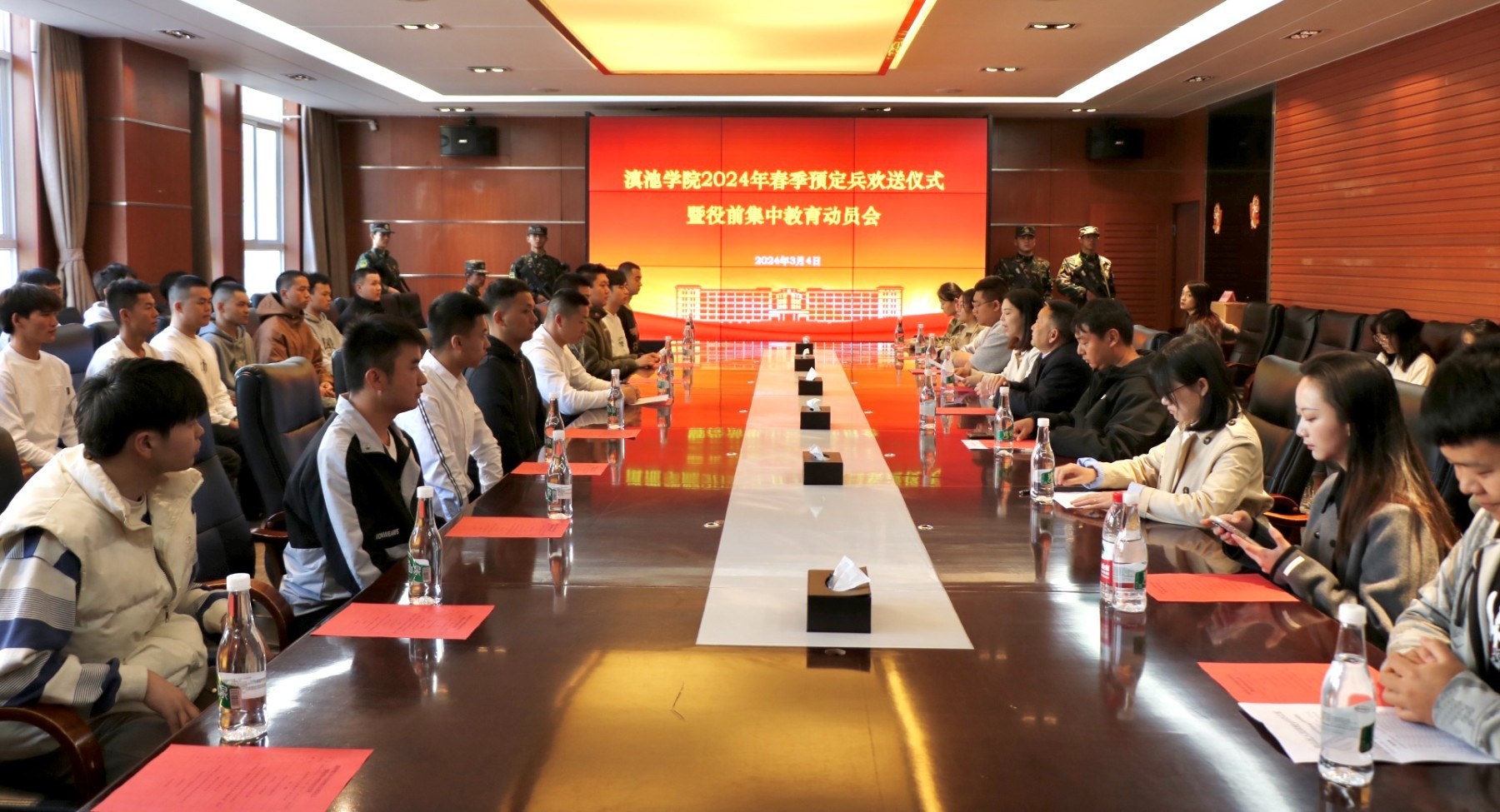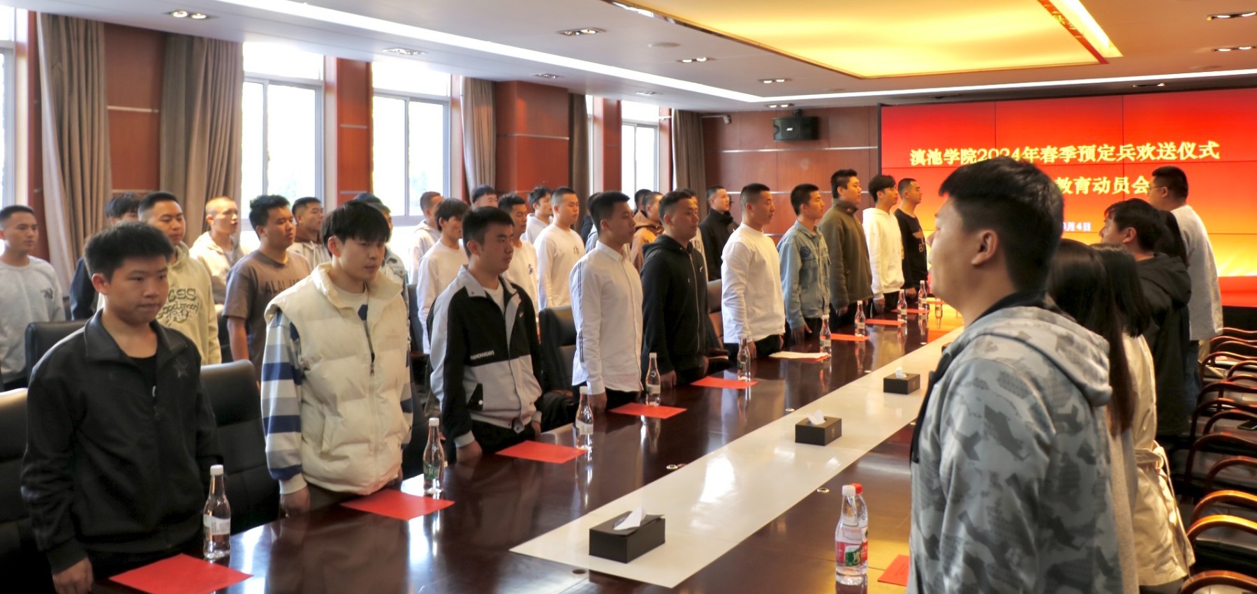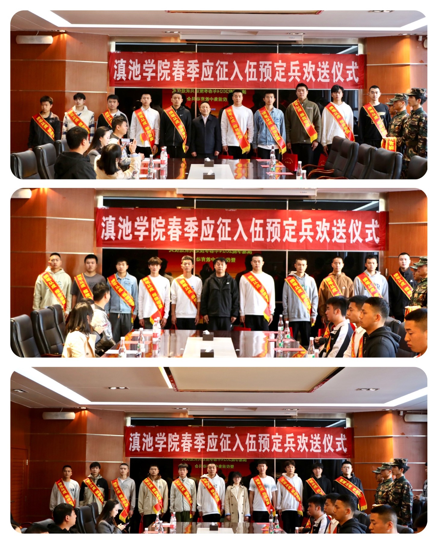 3月5日,滇池学院为30名体检政审双合格的预定兵毕业生举行欢送仪式暨役前集中教育动员会。校党委书记丁恒道,学生处副处长、武装部专职副部长张晋铭,辅导员代表,全体预定兵毕业生,相关职能部门工作人员参加仪式。武装部干事袁双双主持仪式。