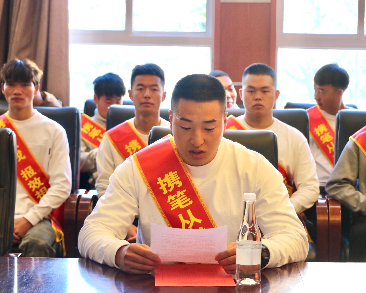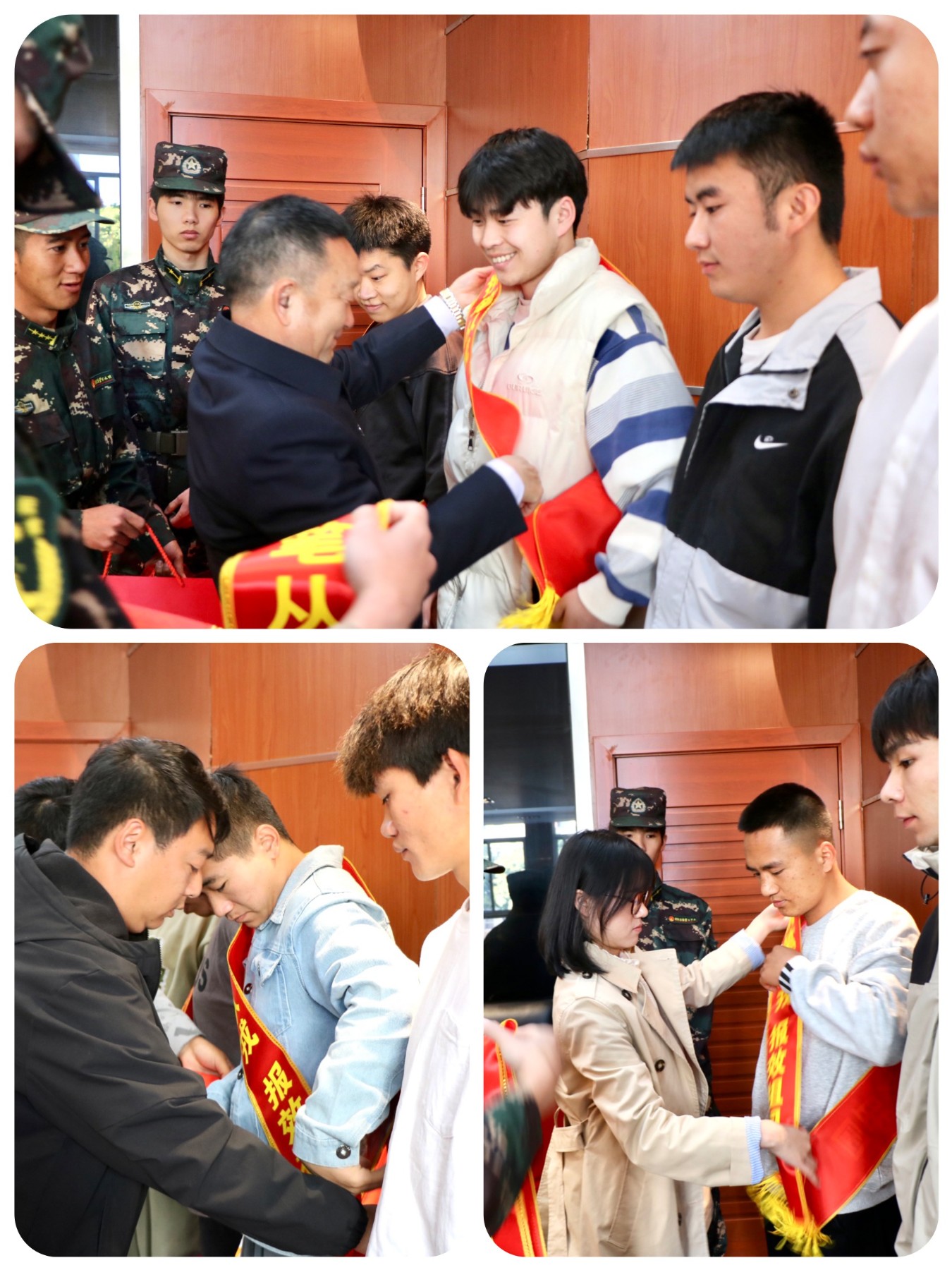 欢送仪式上,参会领导、辅导员代表向预定兵授“携笔从戎,报效祖国”绶带,并赠送纪念品。