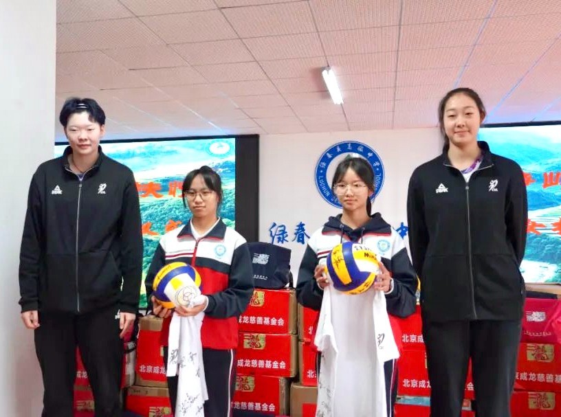 (云南女排队员向绿春县高级中学学生代表捐赠签名排球和球衣)