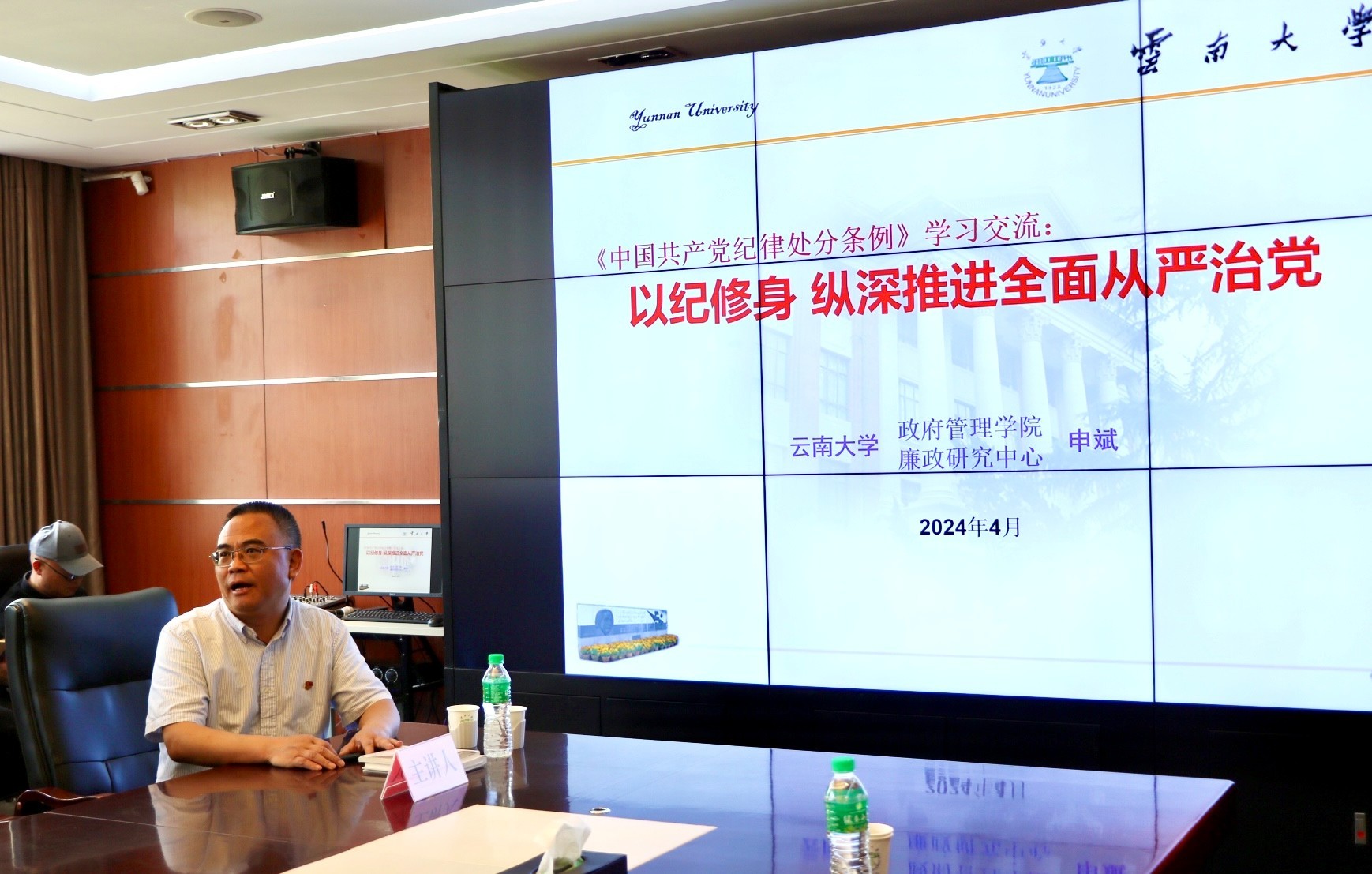 4月29日,学校党纪学习教育读书班邀请云南大学廉政研究中心秘书长、政府管理学院副院长申斌博士到校,以“以纪修身 纵深推进全面从严治党”为题作辅导报告。申斌博士围绕《条例》修订的背景和意义、《条例》的内容及主要特点、《条例》学习教育的要求和建议三个方面,对《条例》进行了深入解读。