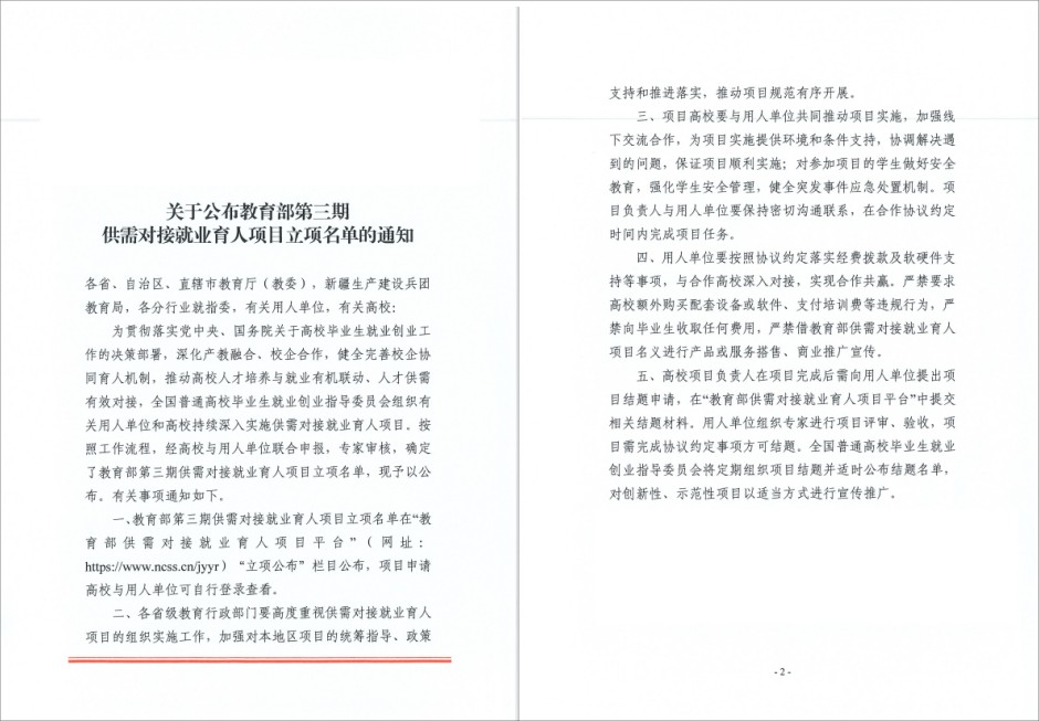 教育部供需对接就业育人项目是落实党中央、国务院决策部署,促进人才供给与需求紧密衔接,深化产教融合校企合作的重要举措。通过项目实施,进一步推动人才培养与就业有机联动、人才供需有效对接,为用人单位培养和招聘更多实用型、复合型和紧缺型人才。