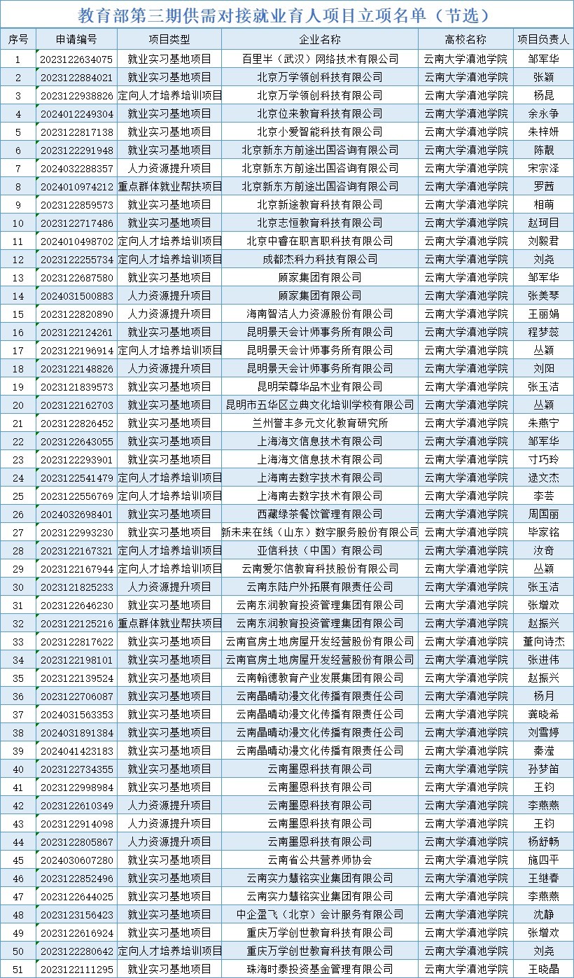 我校与北京万学领创科技有限公司、北京新东方前途出国咨询有限公司、上海海文信息技术有限公司、亚信科技(中国)有限公司、顾家集团有限公司、云南墨恩科技有限公司、昆明景天会计师事务所有限公司、重庆万学创世教育科技有限公司等32家企业达成的51个合作项目获教育部批准立项,立项项目数位居全省高校第一位。其中,定向人才培养培训项目9项、就业实习基地项目32项、人力资源提升项目8项、重点群体就业帮扶项目2项,合作项目涉及金融、信息通讯与互联网、公共管理与服务、建筑地产、教育、科技服务、农林、商贸服务与生活消费、文旅艺术等9个行业。
