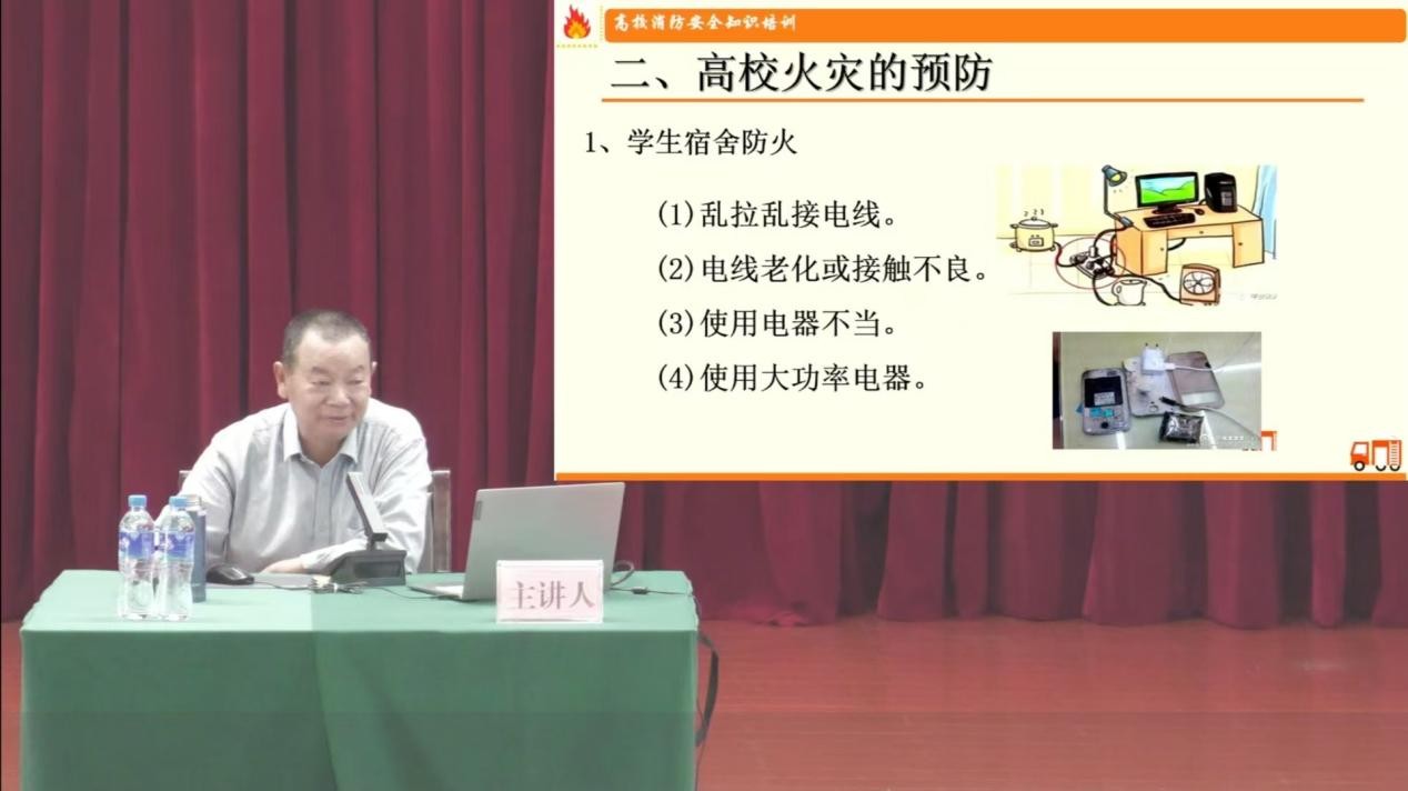 国家文物局消防工程项目评审专家陈晓林副教授从“典型火灾案例分析”、“高校火灾的预防”、“初起火灾扑救”、“火场疏散求生”四个部分进行了消防安全知识专题讲座。陈教授通过典型火灾案例视频,深入分析火灾发生的原因,从防火、灭火、逃生以及消防器材使用等方面,讲解消防安全知识和器材使用及逃生技巧,帮助新生树立消防安全意识,提高自救自助能力。