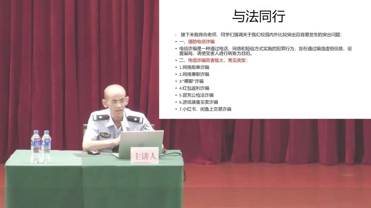 优秀公务员、高级心理咨询师、昆明市公安局滇池国家旅游分局民族村派出所蒋荣华警官以“与法同行”为讲座主题,从防范电信诈骗、交通安全、食品安全、校园矛盾纠纷处理、国家安全等方面,向新生介绍相关案件及法律法规,帮助学子们提高知法、懂法、守法、护法的法律意识,争做遵纪守法的新时代青年。