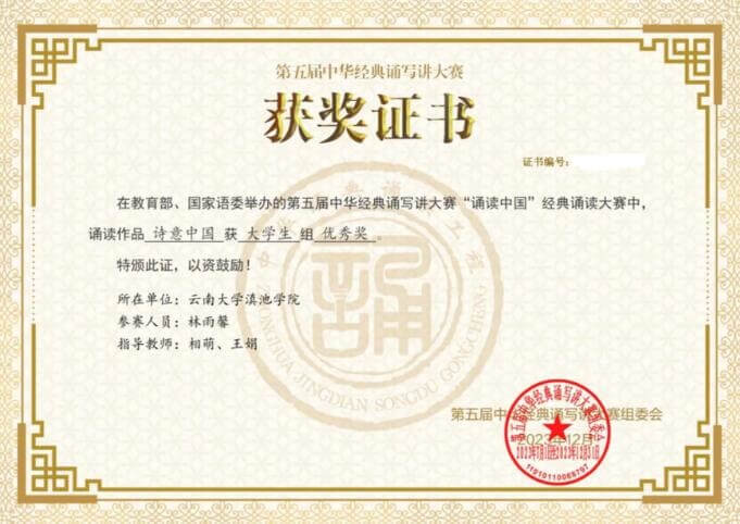 ● 2023年云南省第五届中华经典诵、写、讲大赛一等奖2项,二等奖1项;