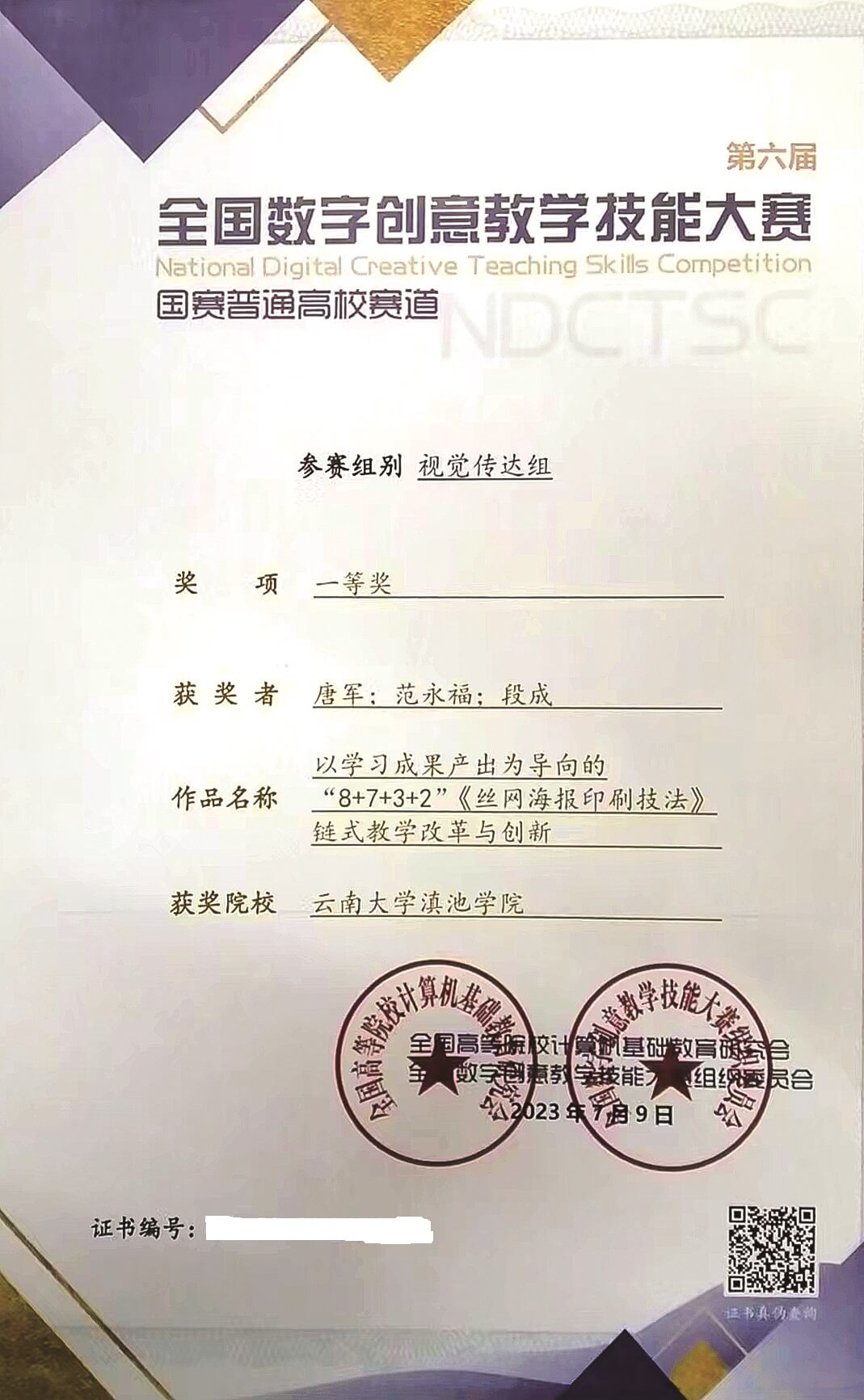 ● 2023年第六届全国数字创意教学大赛全国一等奖1项;