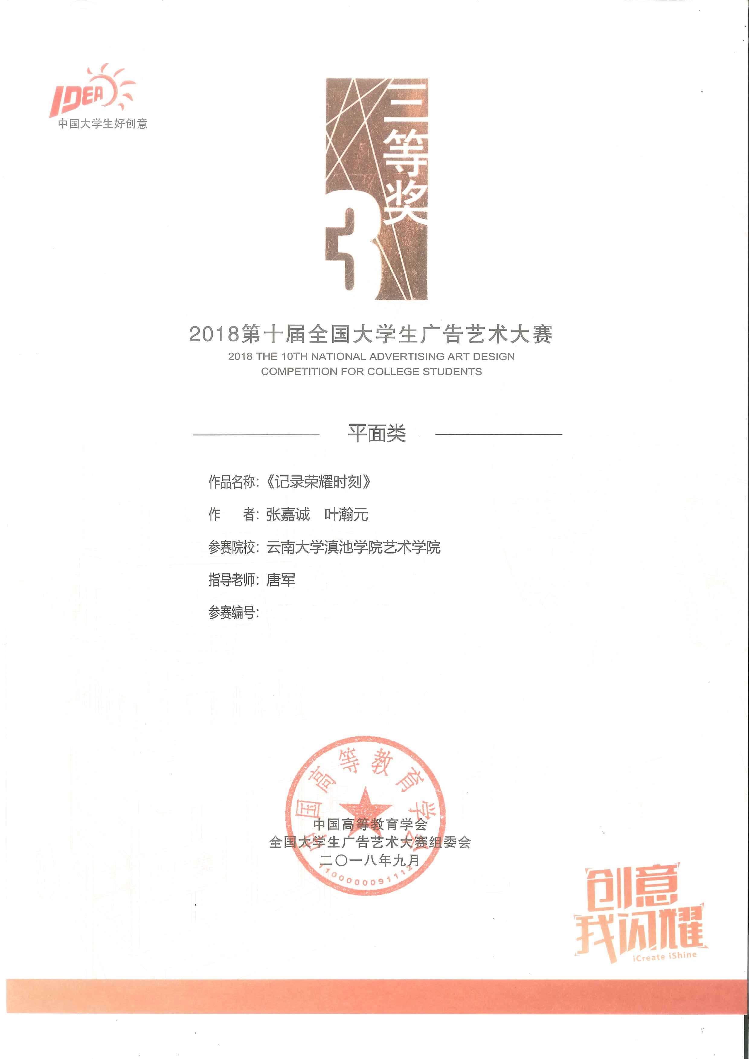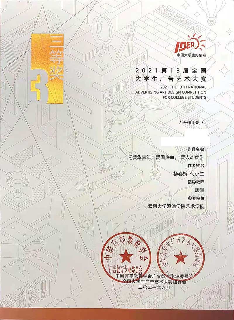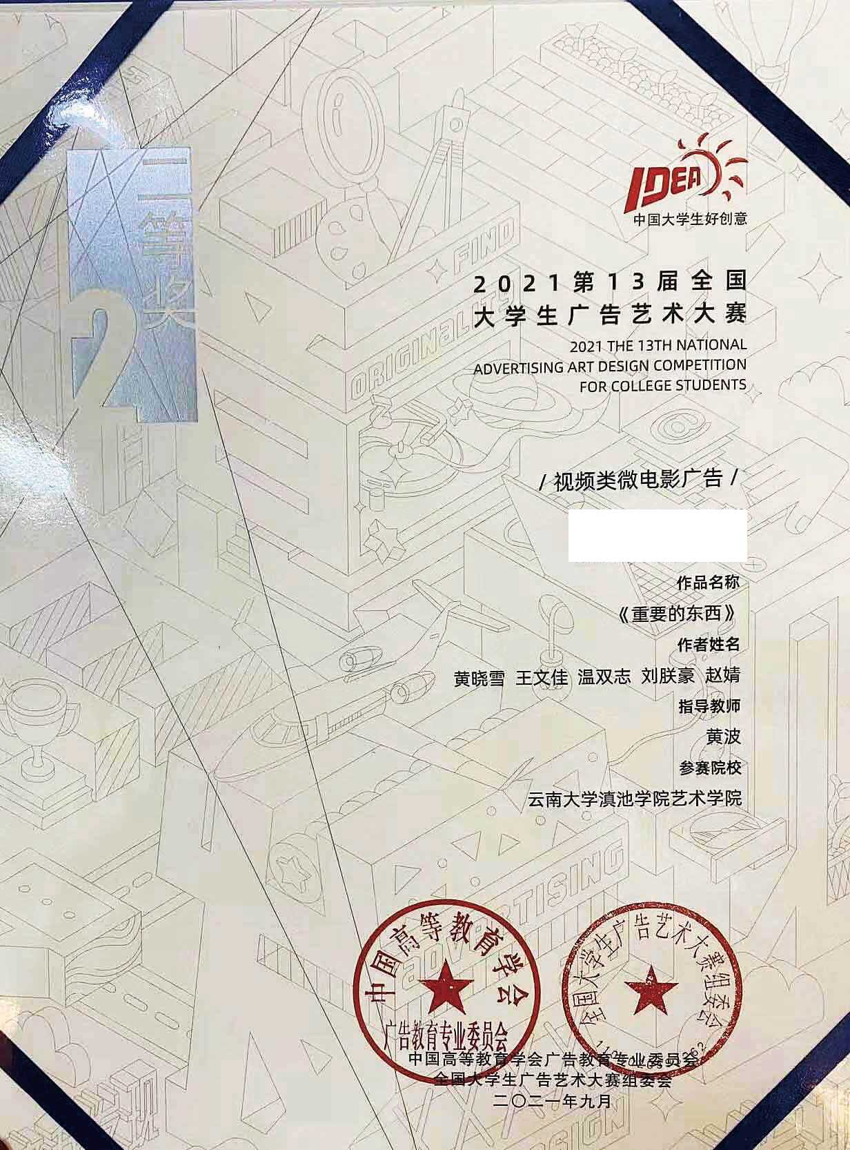 第十三届全国大学生广告艺术大赛,在全国复赛中获得国家级二等奖