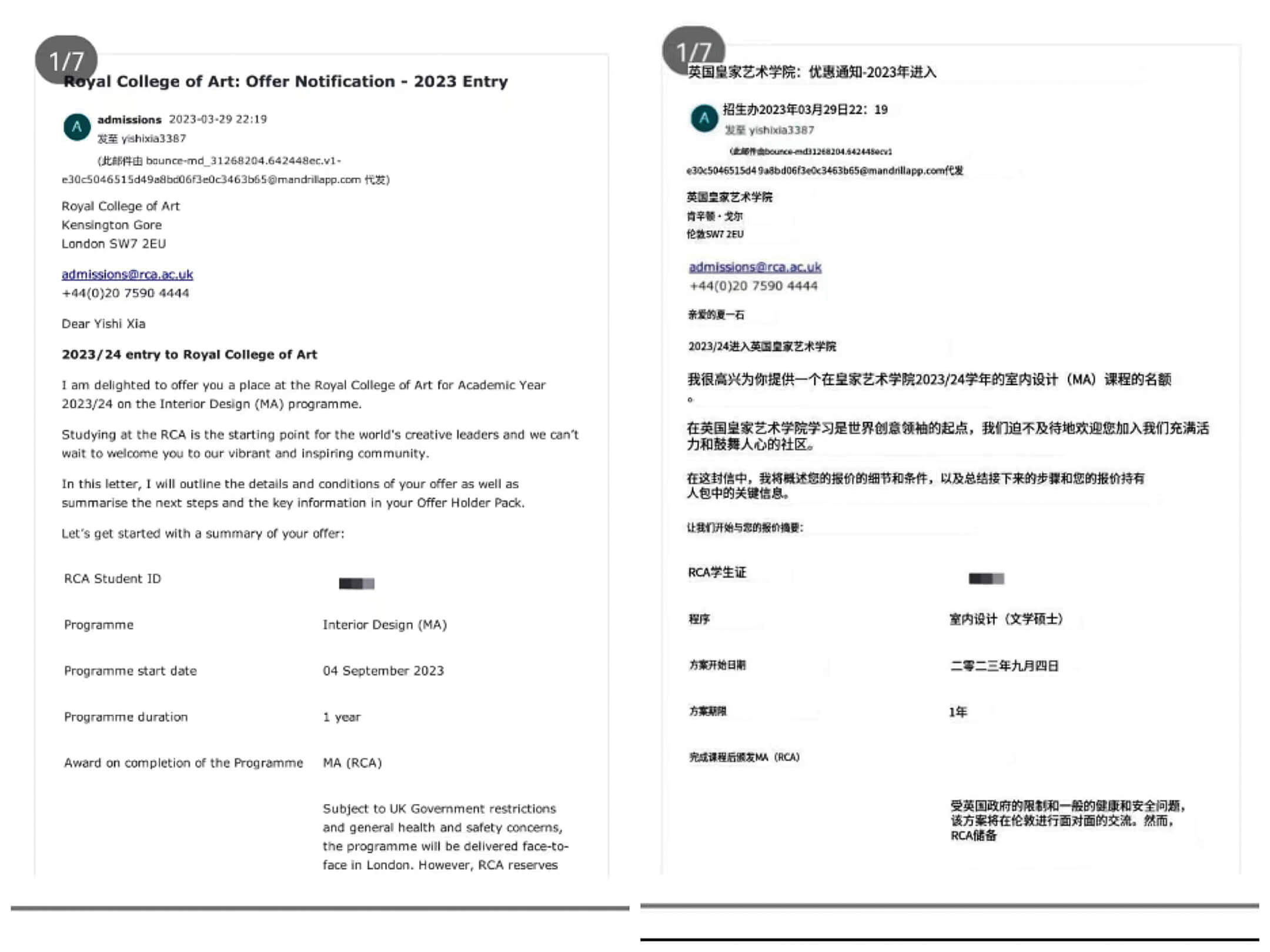 环境设计专业夏时宜同学被全世界 QS 排名第一的英国皇家艺术学院录取